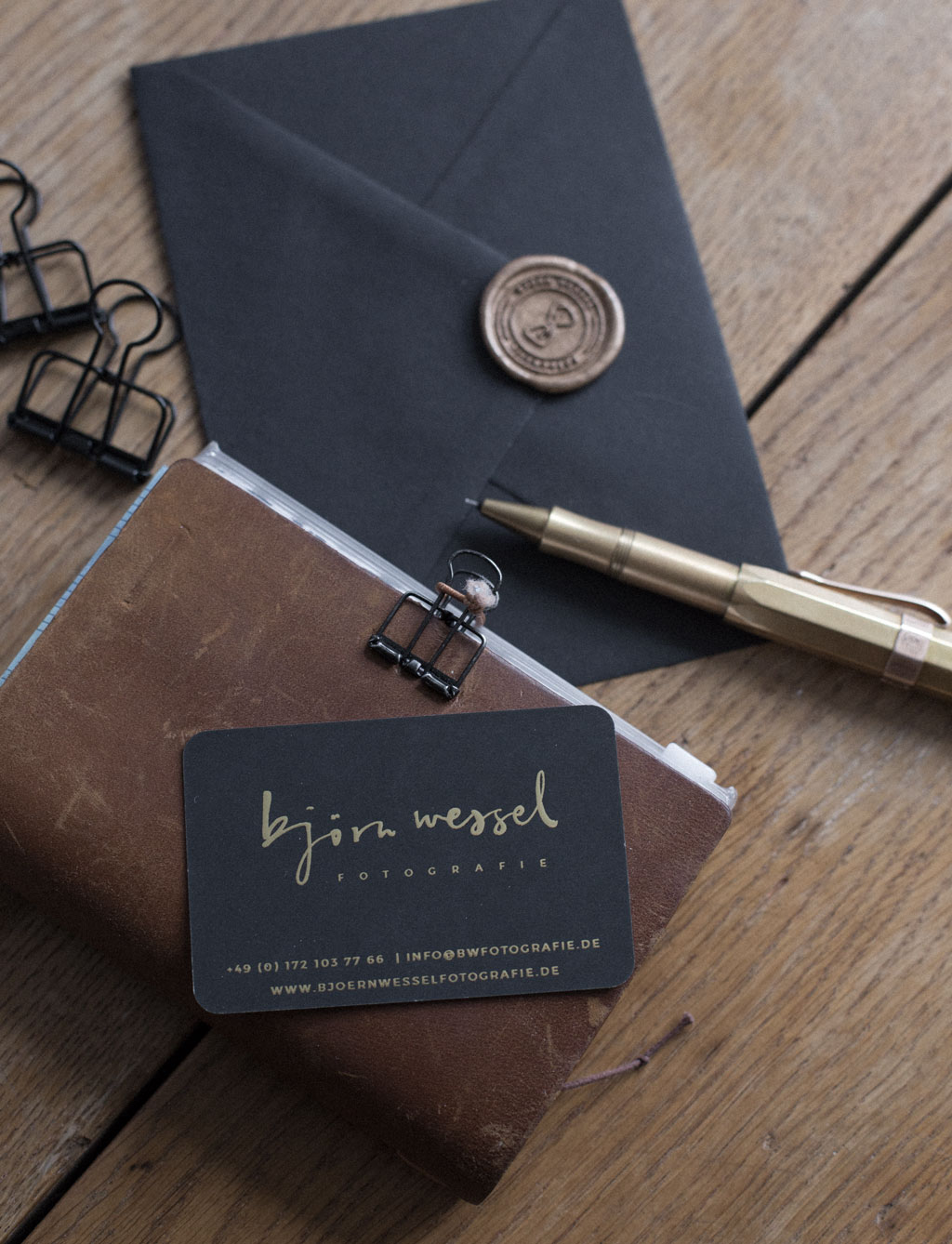 Nicnillas ink designed a new branding for Björn Wessel Fotogafie. She developed a bold design with hand drawn logo and strong patterns for Björn. A waxseal and gold foil business cards add some glam.